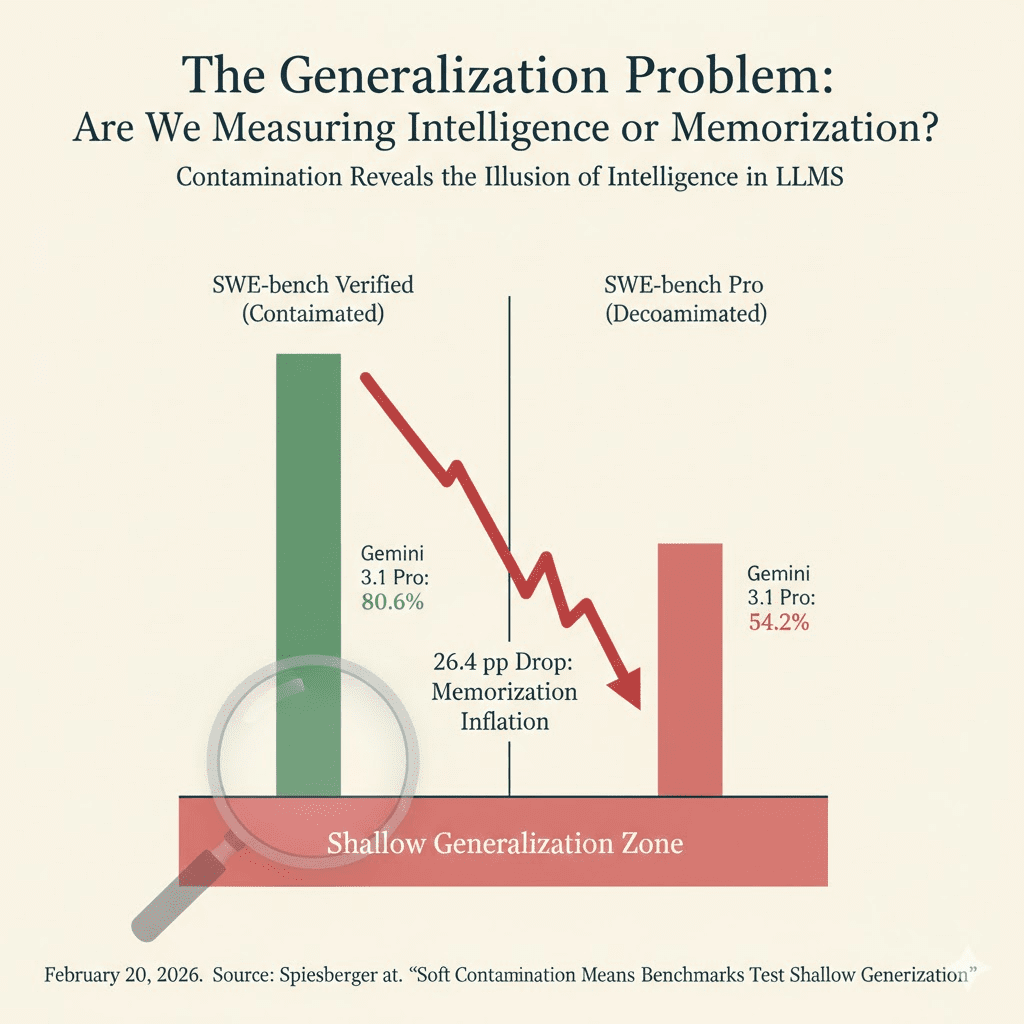 Recent research published in early 2026 reveals a disturbing truth: 78% of Codeforces problems and 50% of logic tasks in common benchmarks have semantic duplicates in model training data. A landmark paper titled “Soft Contamination Means Benchmarks Test Shallow Generalization” (Spiesberger et al.) demonstrated that this contamination can artificially inflate benchmark accuracy by 10-30%.
